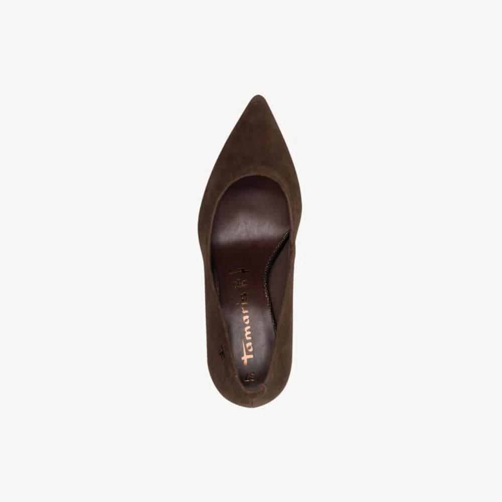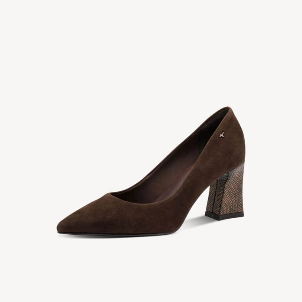 Μια εκλεπτυσμένη γόβα σε ζεστή καφέ suede απόχρωση, σχεδιασμένη να συνδυάζει κομψότητα και άνεση όλη την ημέρα. Κατασκευασμένη από υψηλής ποιότητας δέρμα, αγκαλιάζει απαλά το πόδι, ενώ ο ειδικός πάτος προσαρμόζεται στη μορφή του πέλματος για μέγιστη άνεση σε κάθε βήμα. Το ιδιαίτερο τακούνι ύψους 75 mm, με διακριτικό μοτίβο, προσθέτει μια μοντέρνα πινελιά στο κλασικό design, καθιστώντας τη γόβα ιδανική τόσο για επαγγελματικές εμφανίσεις όσο και για κομψές βραδινές εξόδους.