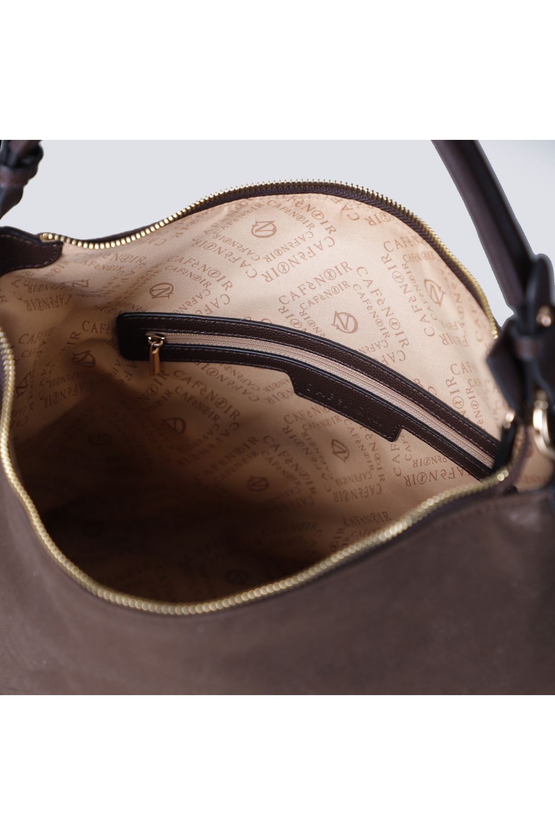 Μαλακή τσάντα με εφέ σουέτ, φερμουάρ και μεταλλικά γράμματα. Αφαιρούμενο λουράκι ώμου και εκλεπτυσμένη εμφάνιση για καθημερινά ρούχα με μποέμ κομψή πινελιά.