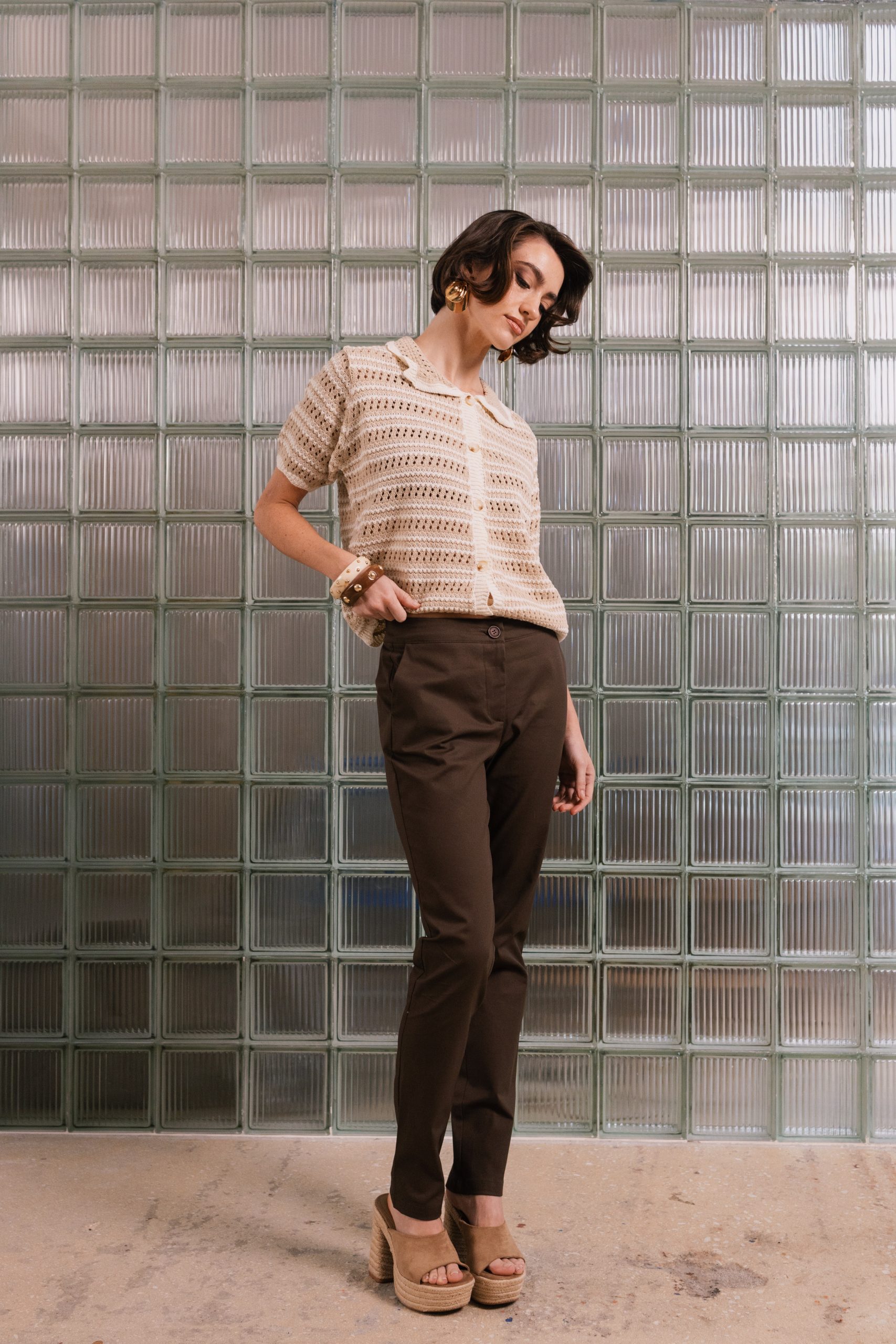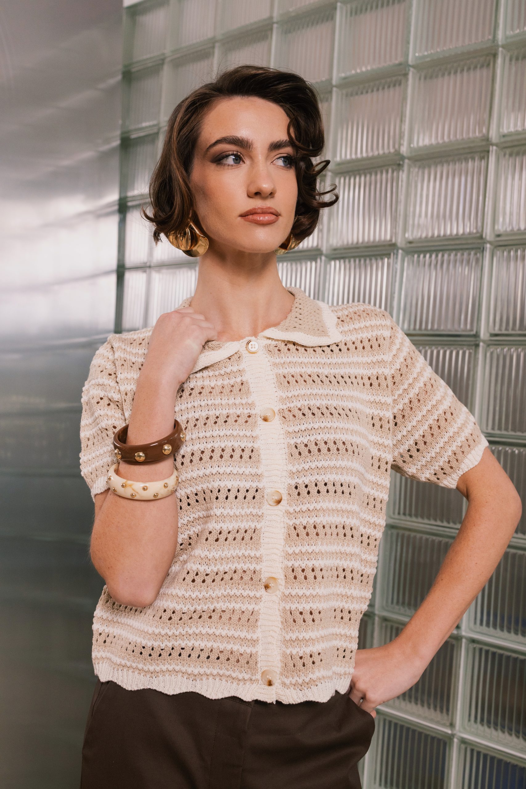 Κομψή πλεκτή μπλούζα με διακριτική διάτρητη πλέξη και κλασικό γιακά που χαρίζει διαχρονικό στυλ. Η άνετη εφαρμογή και το ελαφρύ ύφασμα την κάνουν ιδανική για καθημερινές αλλά και πιο κομψές εμφανίσεις.