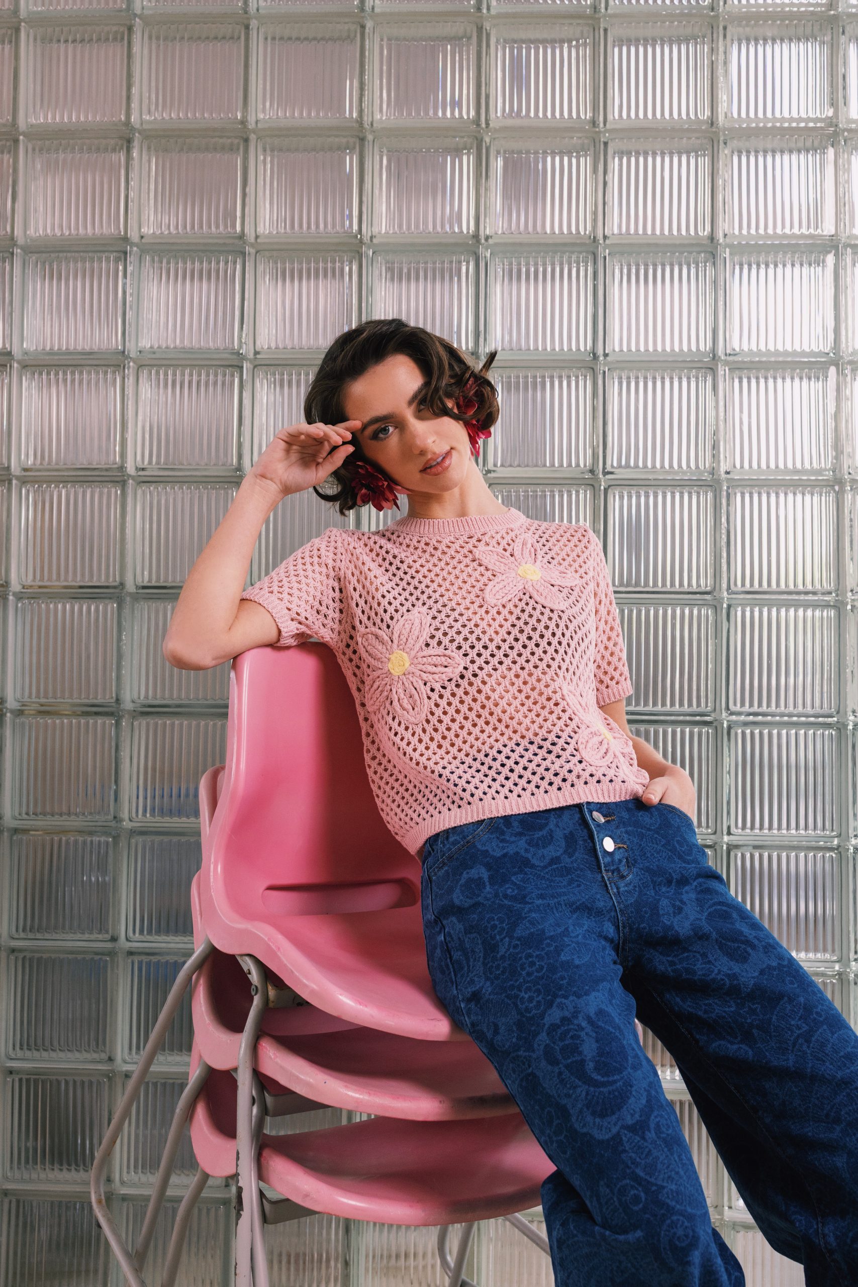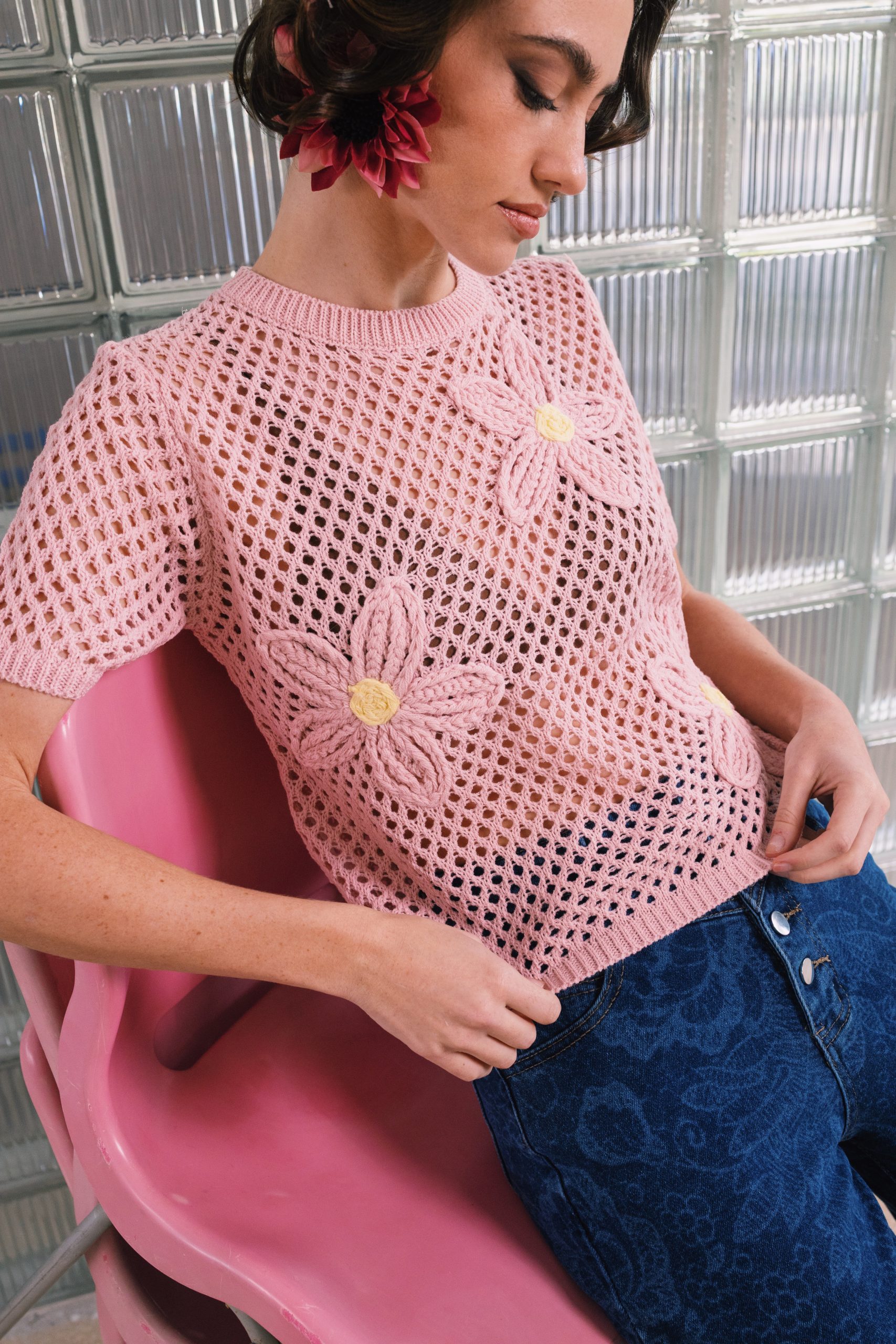 Κομψό πλεκτό top με διάτρητη υφή και διακριτικά floral στοιχεία που χαρίζουν ρομαντικό και μοντέρνο χαρακτήρα. Το ελαφρύ ύφασμα και η άνετη γραμμή το καθιστούν ιδανικό για καλοκαιρινές εμφανίσεις, συνδυάζοντας στυλ και άνεση.