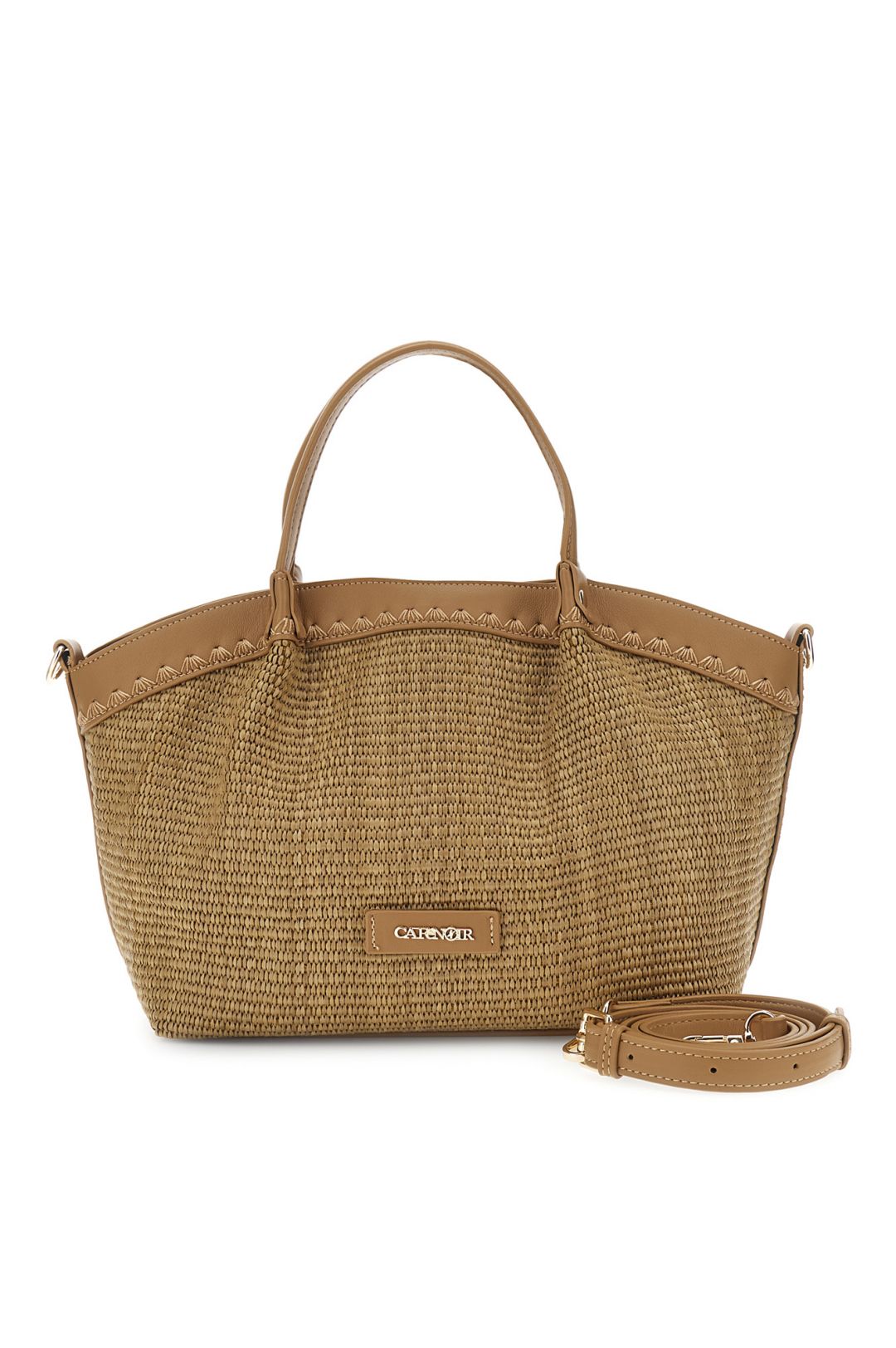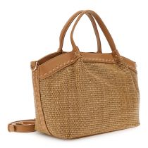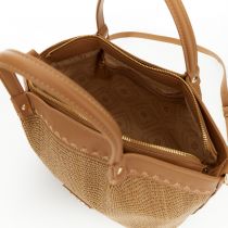 Κομψή ψάθινη τσάντα σε ζεστή hazelnut απόχρωση που συνδυάζει φυσική υφή με διακριτικές δερμάτινες λεπτομέρειες. Ο ευρύχωρος σχεδιασμός και το αποσπώμενο λουρί την καθιστούν ιδανική επιλογή για καθημερινή χρήση αλλά και καλοκαιρινές εμφανίσεις με στυλ.