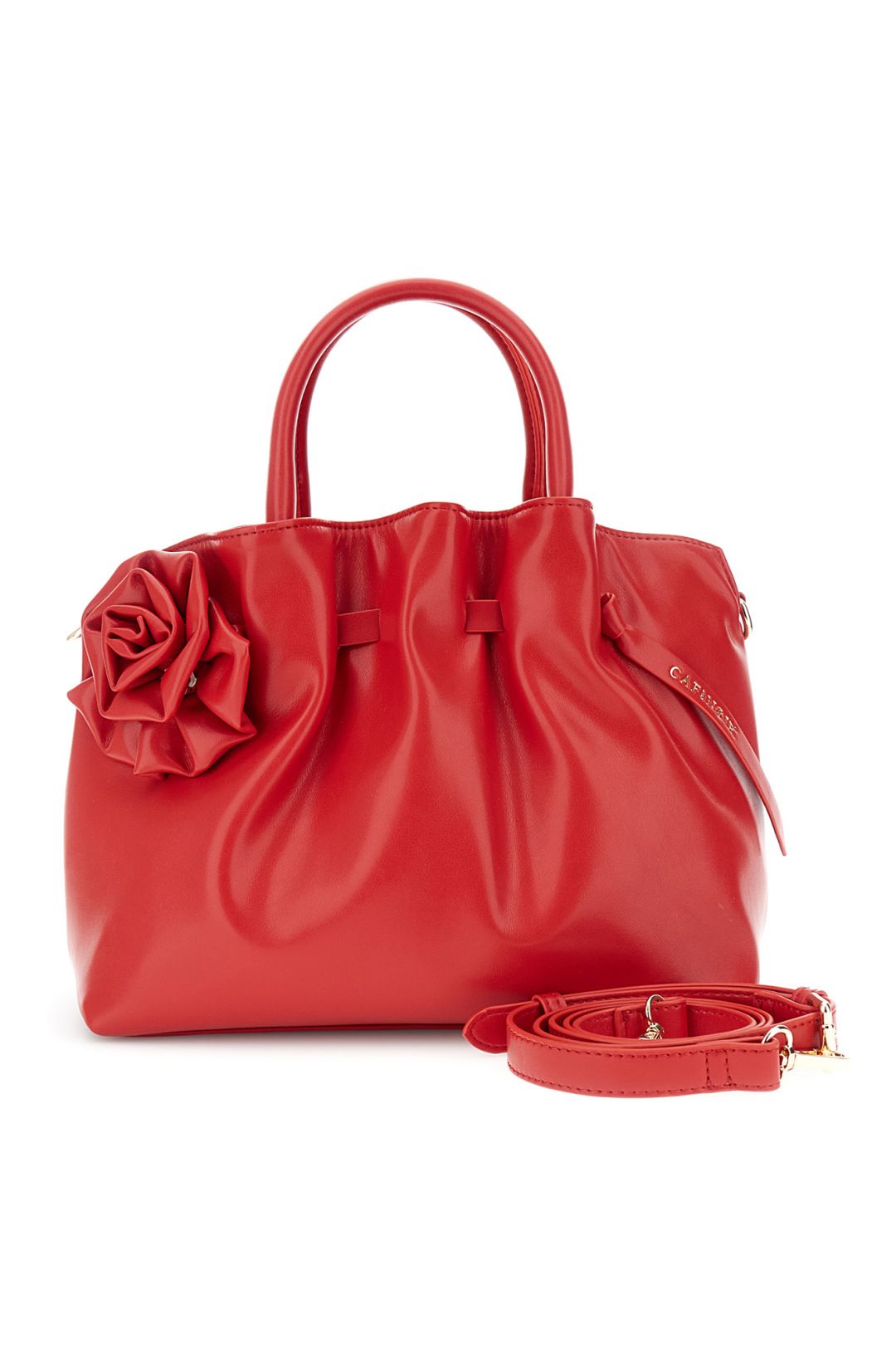 Εντυπωσιακή τσάντα χειρός σε έντονη κόκκινη απόχρωση που αποπνέει θηλυκότητα και κομψότητα. Το ιδιαίτερο διακοσμητικό λουλούδι και το soft design δημιουργούν ένα statement κομμάτι που ξεχωρίζει σε κάθε εμφάνιση. Φοριέται εύκολα και χιαστί χάρη στο αποσπώμενο λουρί, συνδυάζοντας στυλ και πρακτικότητα.