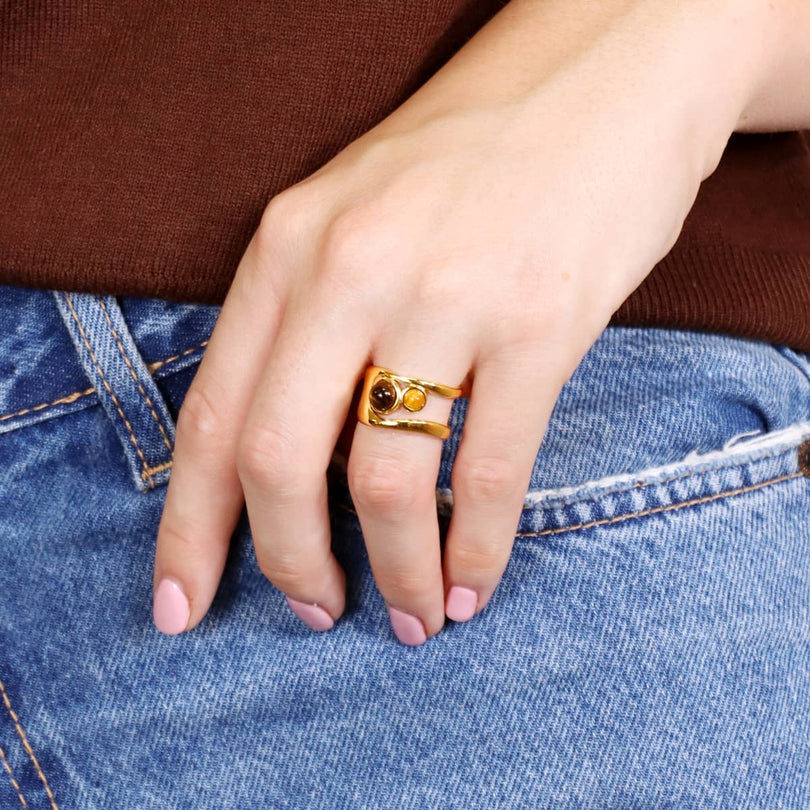 Το δαχτυλίδι Liora Waves αψηφά τις συμβατικές τάσεις με τον τολμηρό σχεδιασμό του, εμπνευσμένο από οργανικά σχήματα που αγκαλιάζουν το δέρμα σας με ακαταμάχητες καμπύλες. Κατασκευασμένο από υποαλλεργικό, αδιάβροχο, επιχρυσωμένο χειρουργικό ατσάλι, συνδυάζει τη δύναμη με την κομψότητα μιας φυσικής πέτρας σε γήινους τόνους. Αφαιρέστε τα πριν κάνετε ντους, πλύνετε τα χέρια σας ή ασκηθείτε. Εάν έρθουν σε επαφή με νερό, στεγνώστε τα καλά πριν τα αποθηκεύσετε.