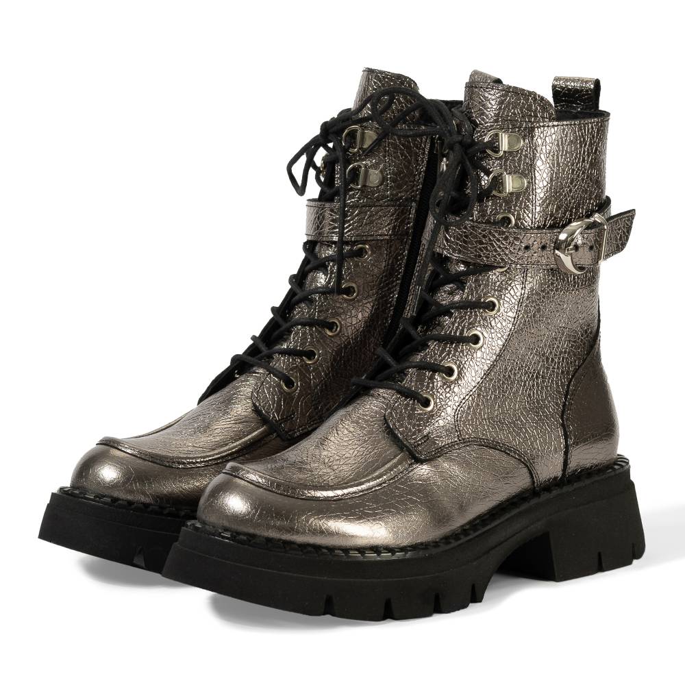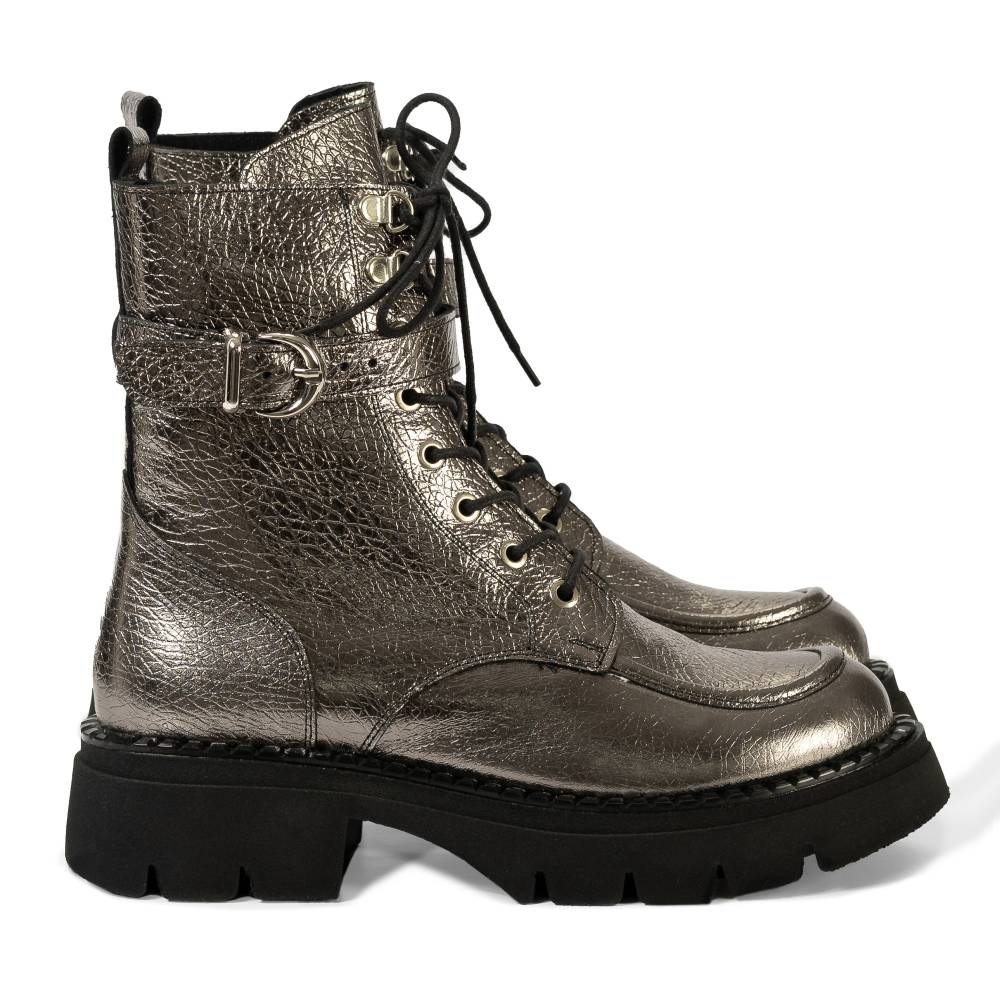 Εντυπωσιακό και μοντέρνο, το γυναικείο αρβυλάκι σε ασημί σπαστό δέρμα συνδυάζει τον δυναμισμό με την κομψότητα. Το premium φυσικό δέρμα χαρίζει ιδιαίτερη λάμψη και υφή, ενώ η ανατομική σχεδίαση προσφέρει άνεση σε κάθε βήμα. Διαθέτει κορδόνια για απόλυτη προσαρμογή στο πόδι και φερμουάρ στο πλάι για εύκολη εφαρμογή. Η στιβαρή chunky σόλα και το άνετο τακούνι 5 cm εξασφαλίζουν σταθερότητα και πολύωρη χρήση, ιδανική για καθημερινό και δυναμικό urban style.