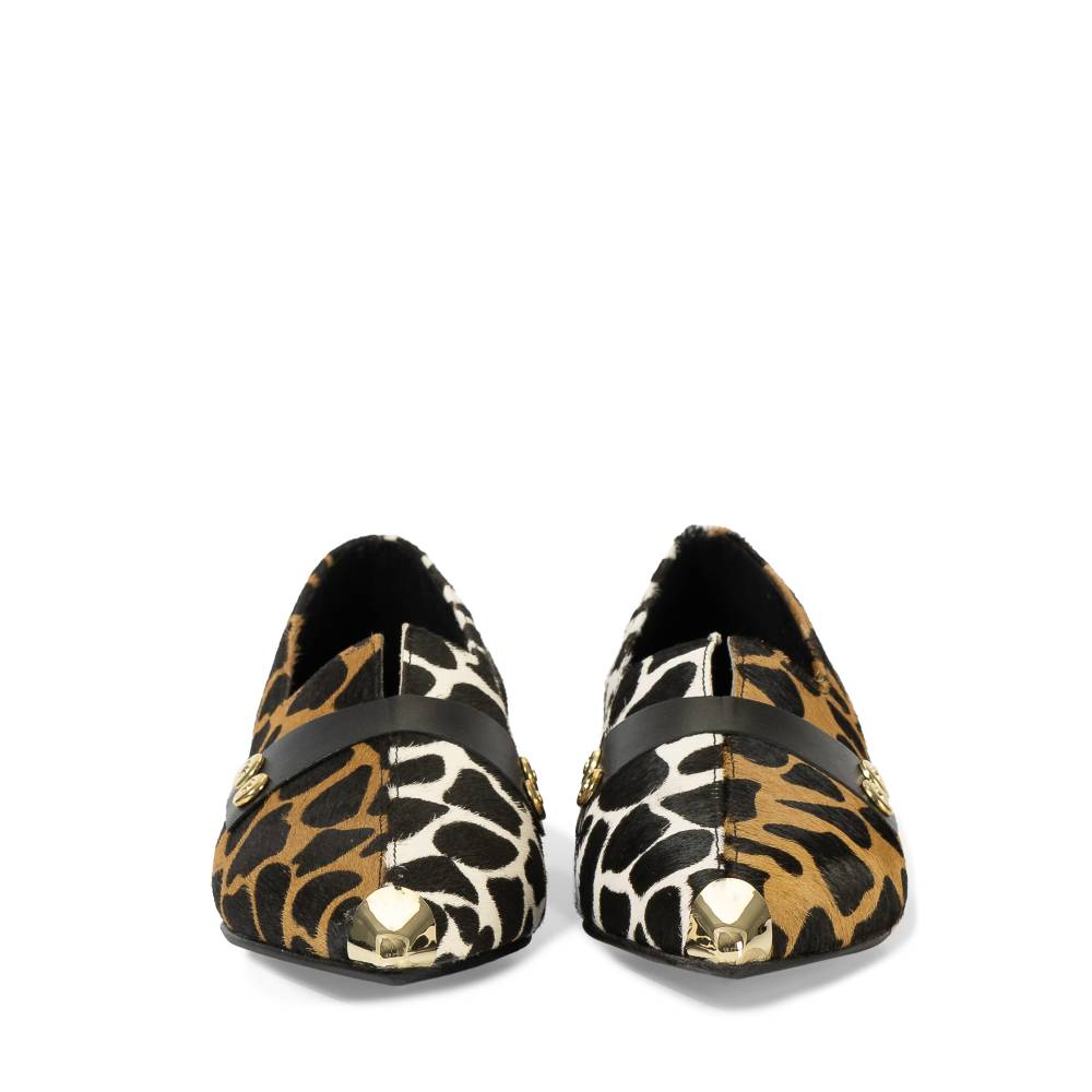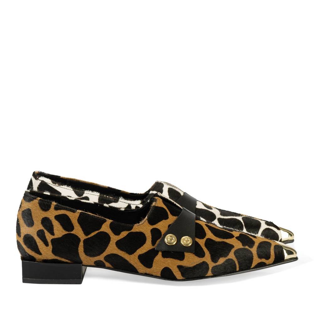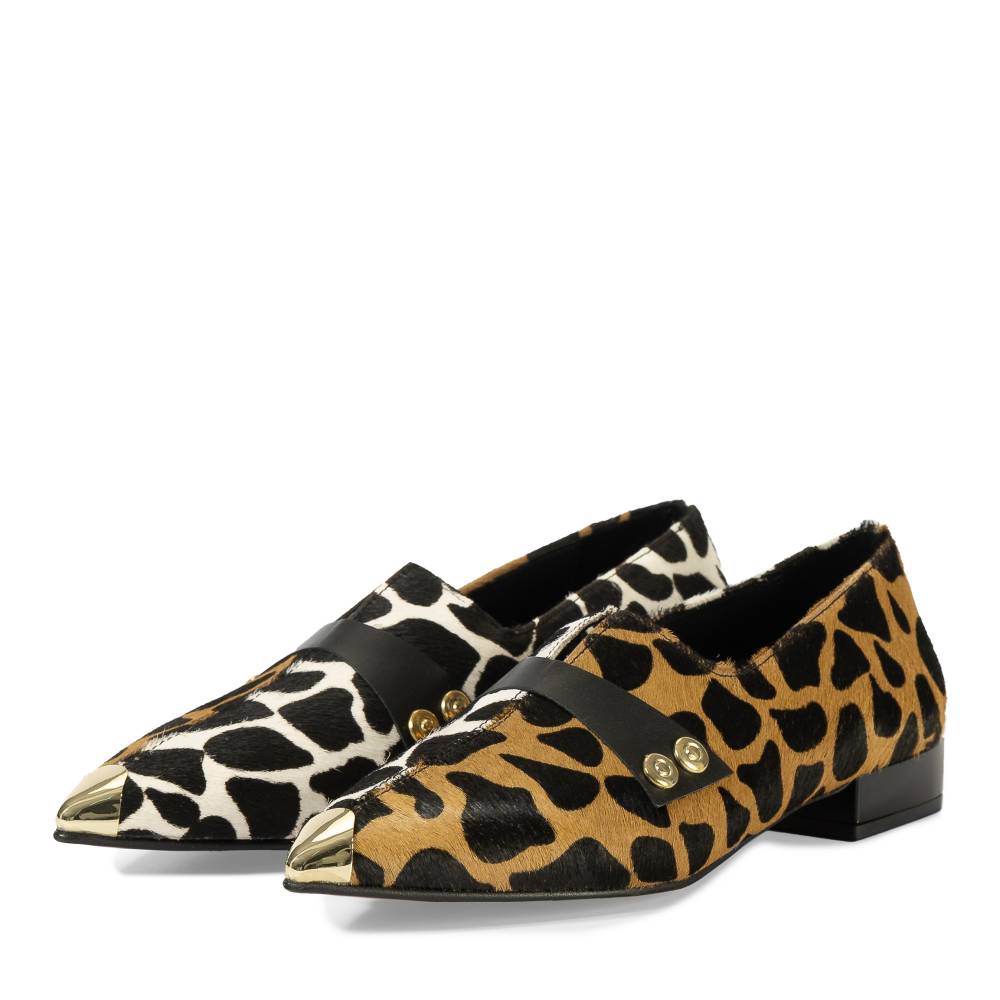 Ένα statement δερμάτινο loafer που ξεχωρίζει για τον ιδιαίτερο συνδυασμό leopard και cow print. Κατασκευασμένο από υψηλής ποιότητας δέρμα και pony skin, προσφέρει πολυτέλεια και μοναδική υφή. Διαθέτει χαμηλό τακούνι για άνεση όλη την ημέρα, ενώ οι χρυσές μεταλλικές λεπτομέρειες και τα τρούκς του προσθέτουν μια glam πινελιά που απογειώνει κάθε εμφάνιση.
