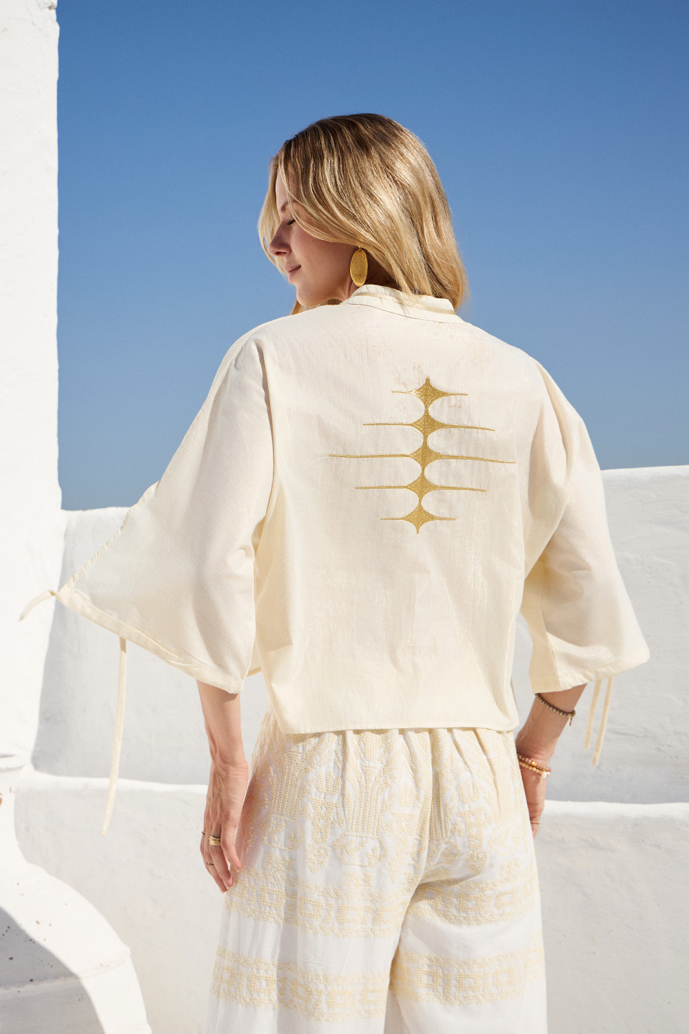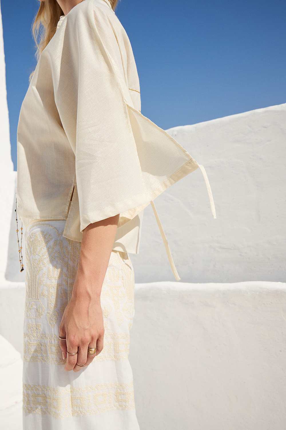 Κομψή και ανάλαφρη πουκαμίσα σε απαλή μπεζ απόχρωση, με διακριτική μεταλλική λάμψη που χαρίζει πολυτέλεια. Η χαλαρή γραμμή και τα αέρινα μανίκια δημιουργούν ένα effortless chic αποτέλεσμα.