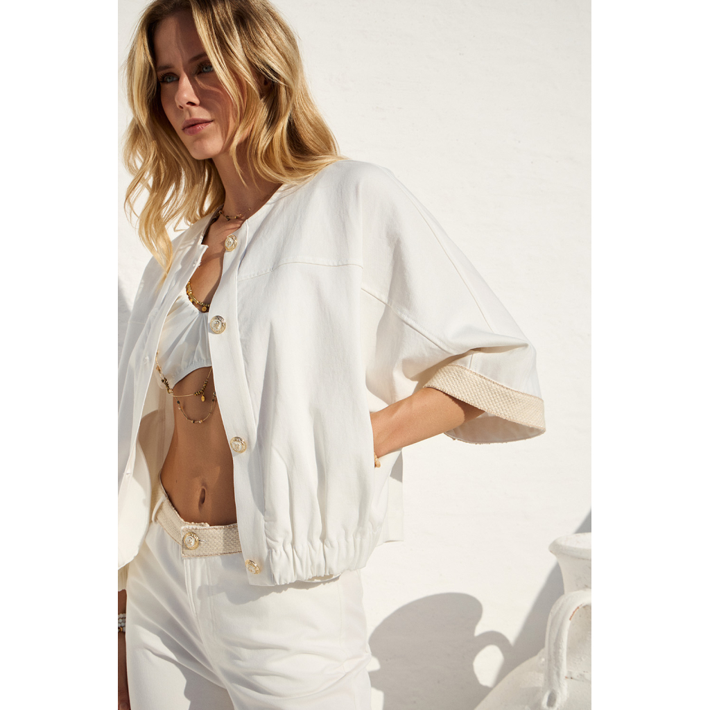 Κομψό κάπρι παντελόνι σε καθαρή λευκή απόχρωση, με minimal αισθητική και ιδιαίτερη υφαντή ζώνη που προσθέτει χαρακτήρα. Ιδανική για chic καθημερινές αλλά και πιο προσεγμένες εμφανίσεις.