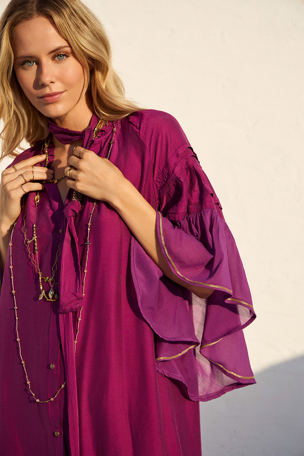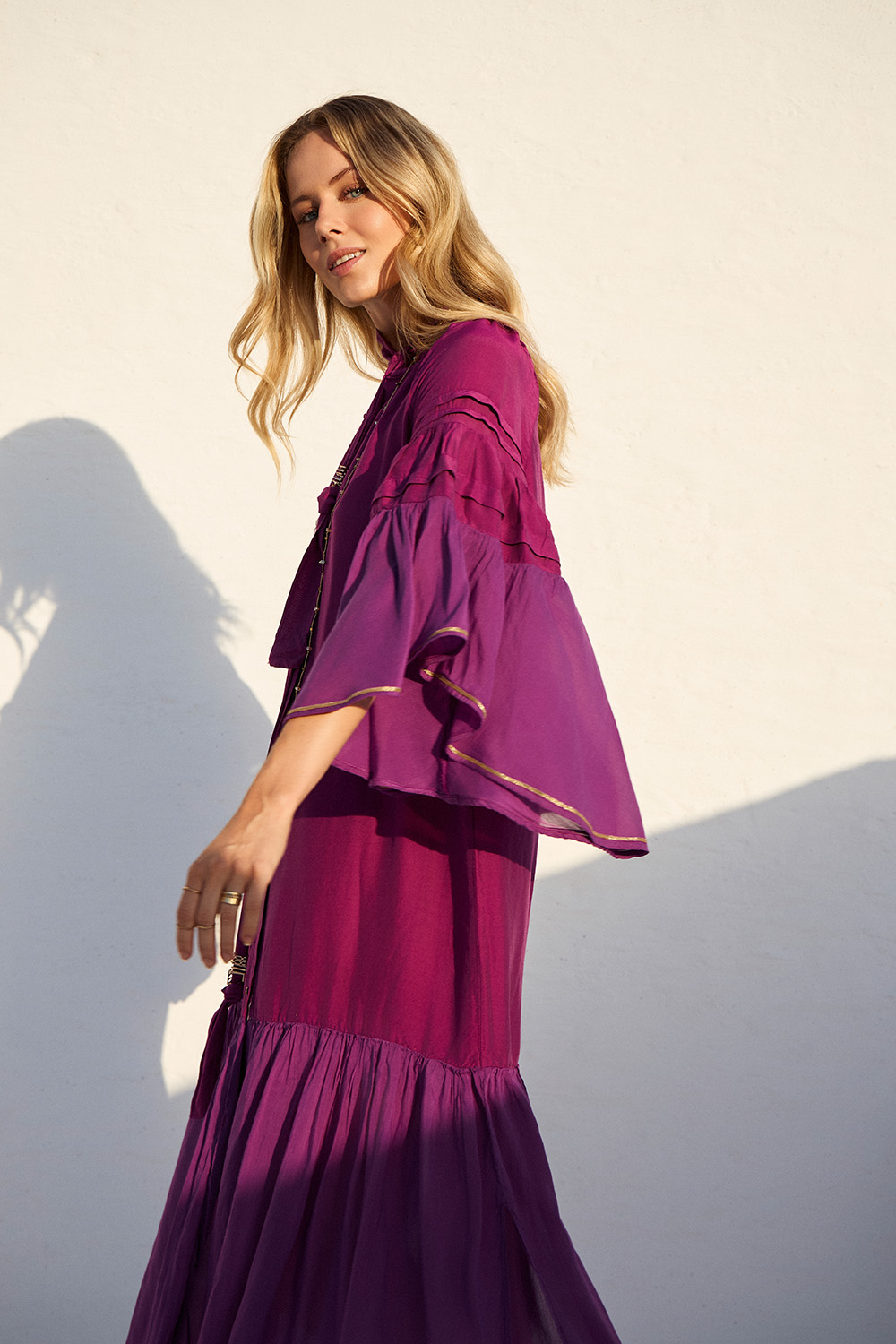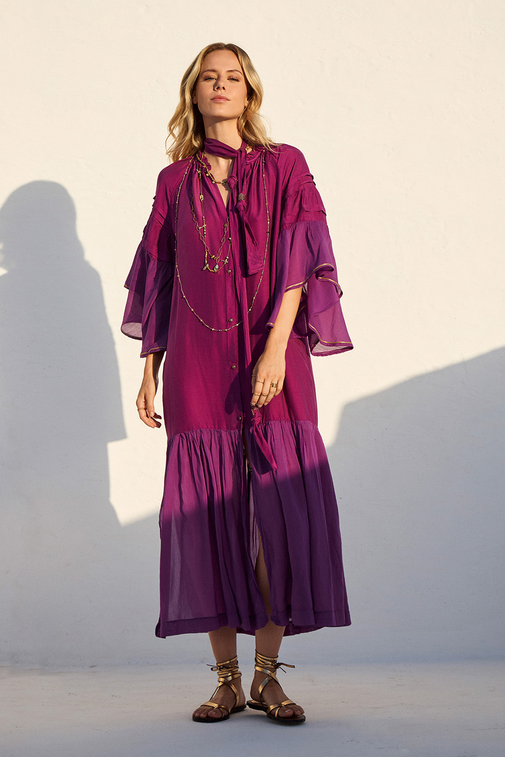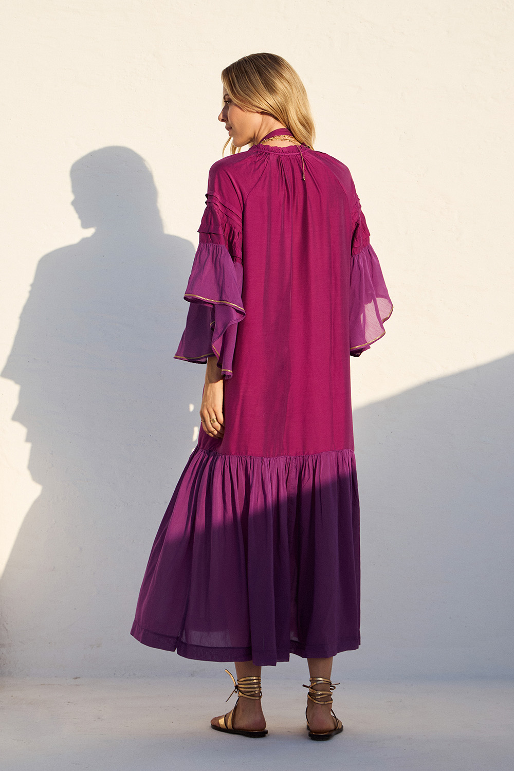 Αέρινο maxi φόρεμα με μεταξένια υφή και boho αισθητική. Τα βολάν και η χαλαρή γραμμή προσφέρουν κομψότητα και άνεση για κάθε καλοκαιρινή εμφάνιση.