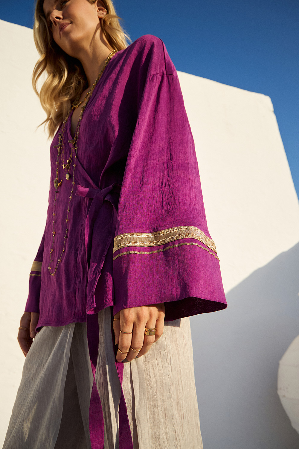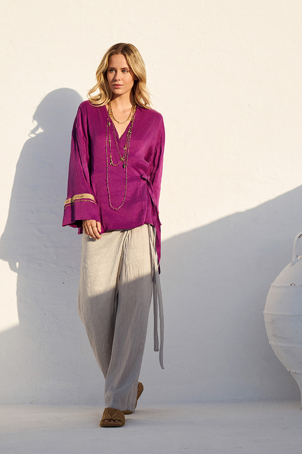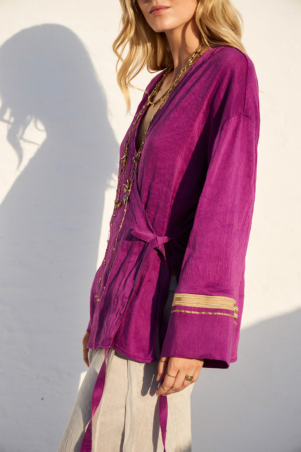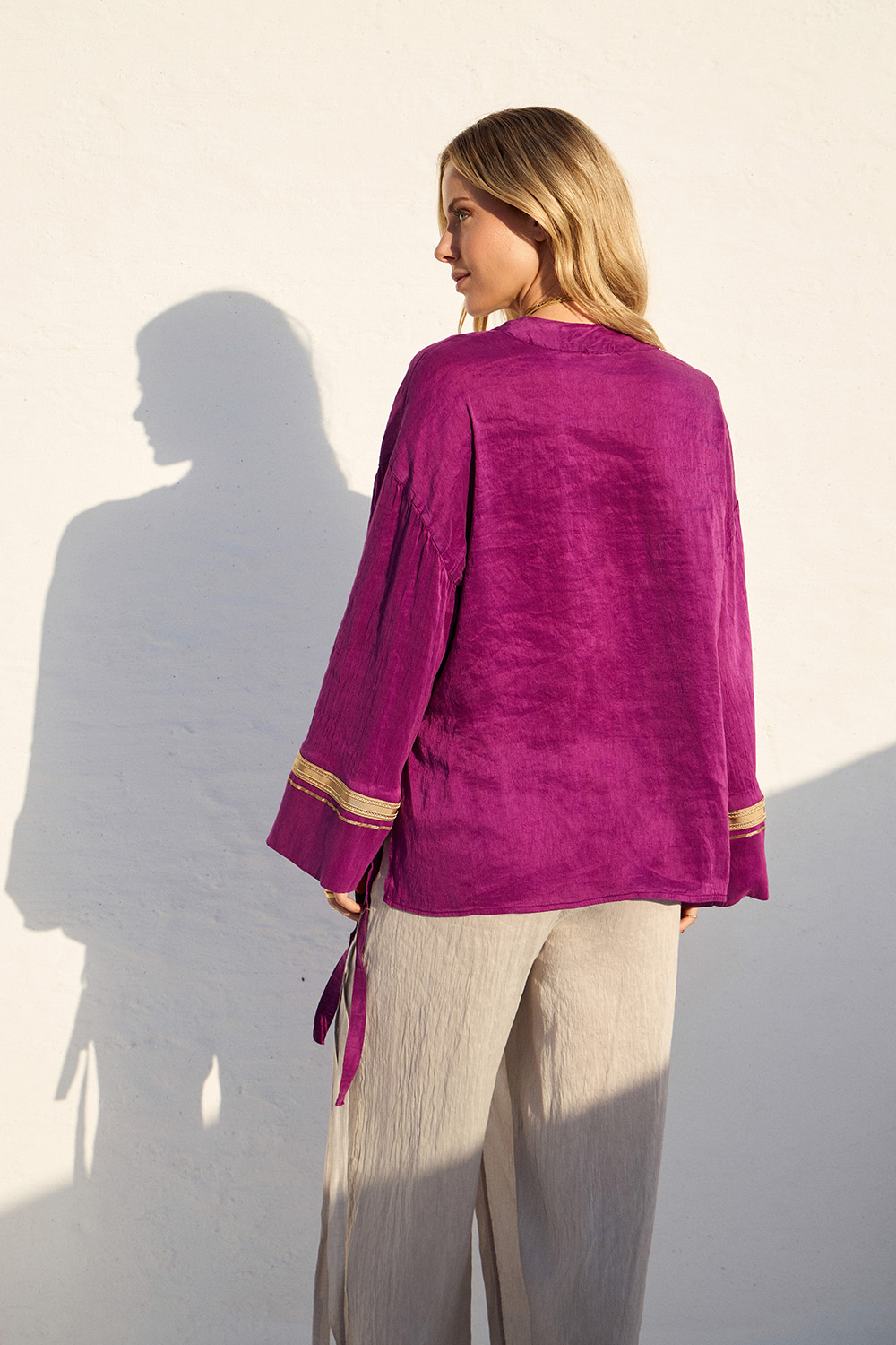 Αέρινη μπλούζα σε έντονη μωβ απόχρωση, με χαλαρή γραμμή και διακοσμητικές λεπτομέρειες στα μανίκια. Ο συνδυασμός λινού και μεταξιού προσφέρει δροσερή αίσθηση και μοναδικό boho χαρακτήρα.