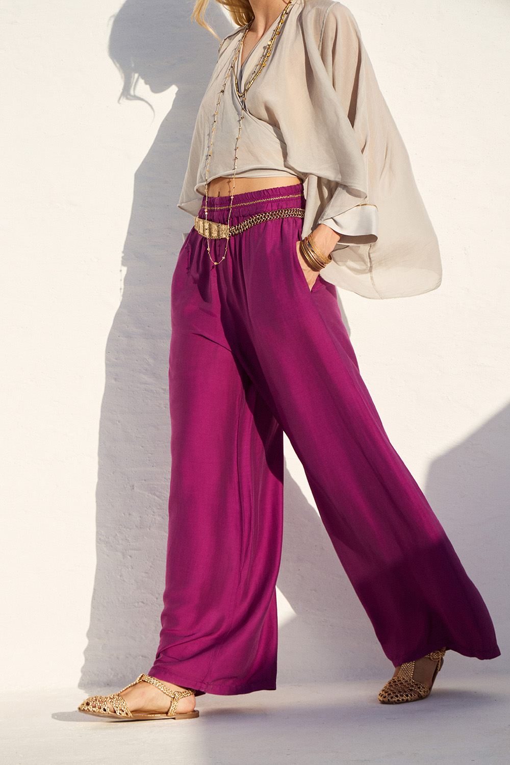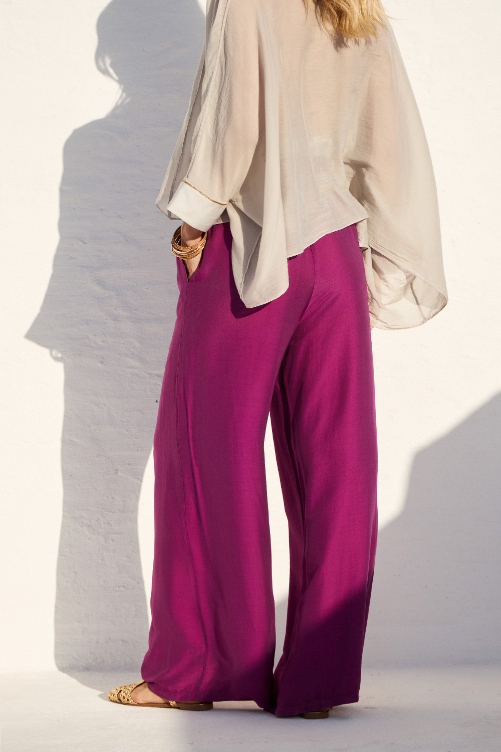 Αέρινο παντελόνι με φαρδιά γραμμή και μεταξένια υφή που προσφέρει άνεση και κομψότητα. Ιδανικό για relaxed αλλά stylish καλοκαιρινά looks.