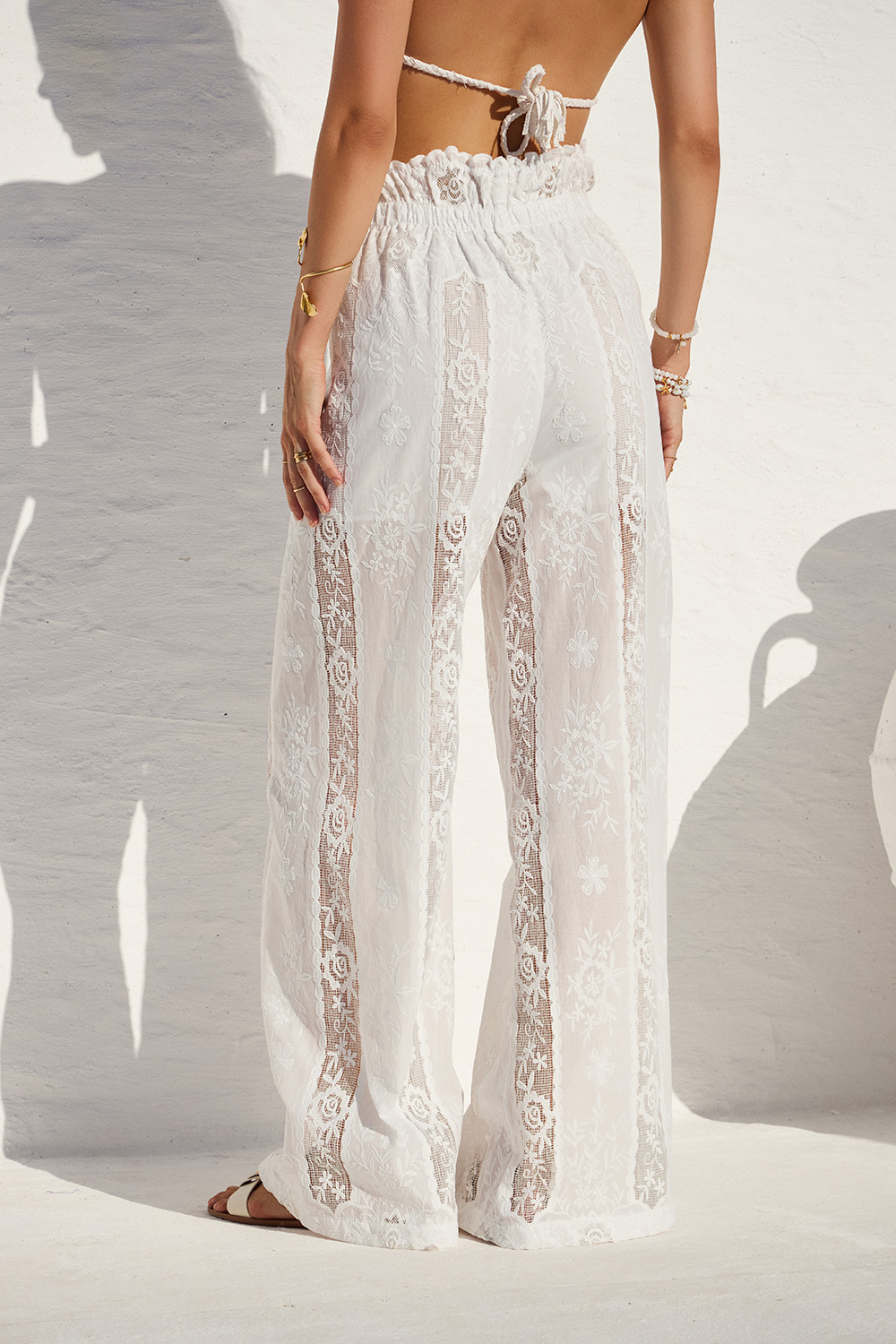 Αέρινη παντελόνα από δαντέλα σε λευκή απόχρωση, που αποπνέει ρομαντισμό και καλοκαιρινή κομψότητα. Η διάφανη υφή και η χαλαρή γραμμή δημιουργούν ένα εντυπωσιακό resort look.