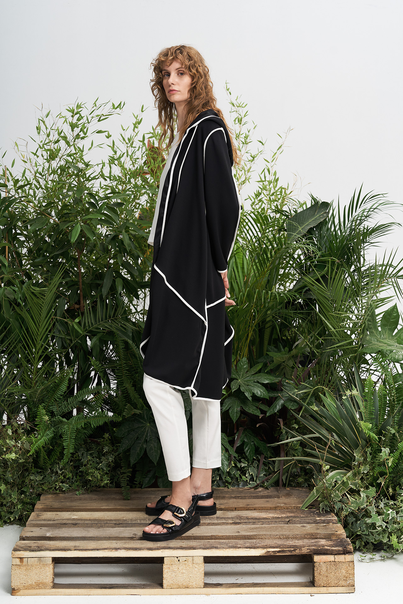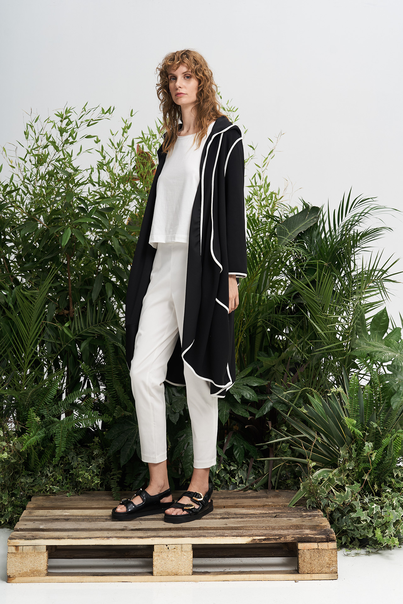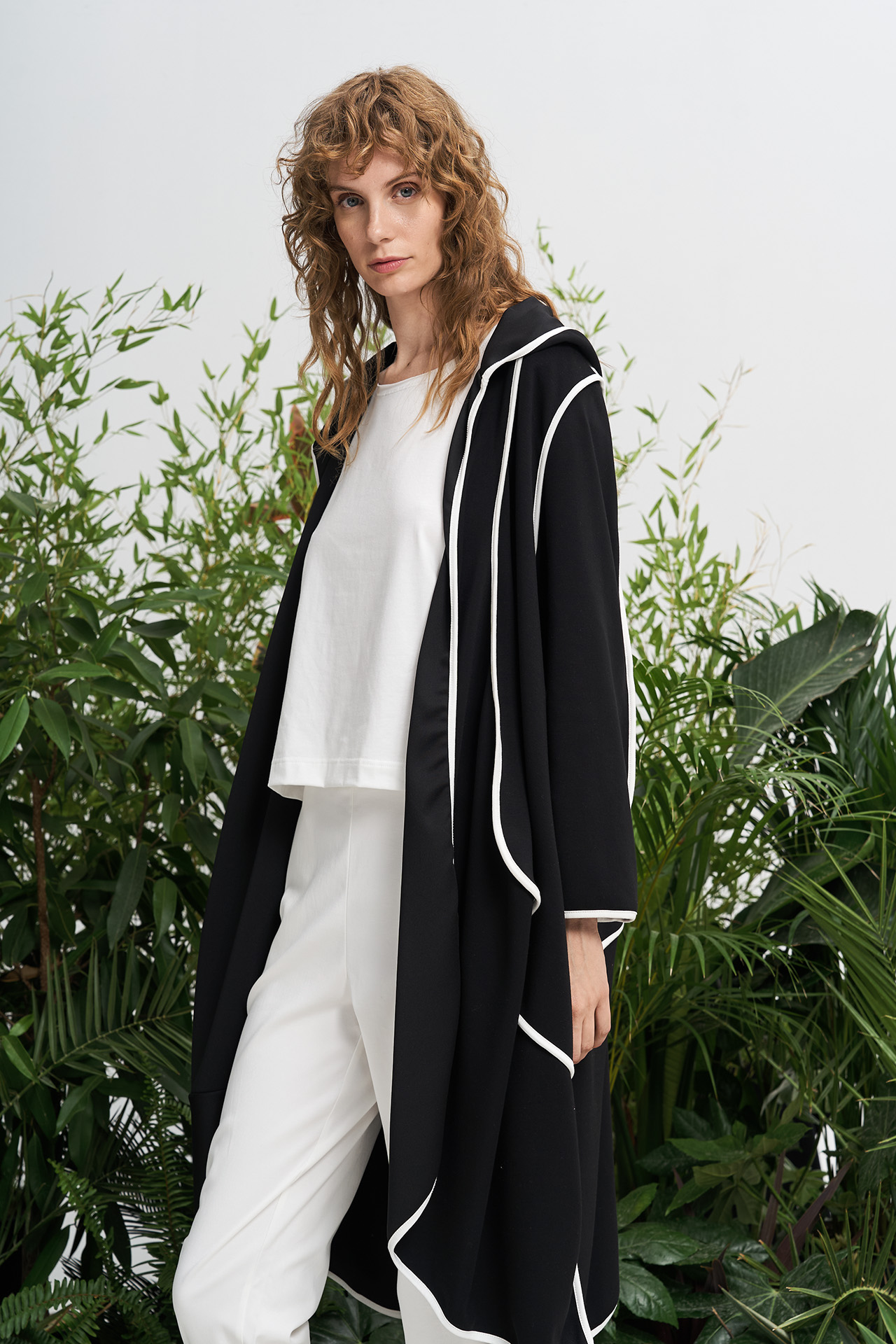 Μακριά ζακέτα με κουκούλα. Το πλούσιο ύφασμα “πέφτει” αρμονικά δημιουργώντας πτυχώσεις και σε συνδυασμό με τις εξωτερικές άσπρες λεπτομέρειες δημιουργείται ένα εντυπωσιακό effortless αποτέλεσμα. Πρόκειται για ένα item με sportive αισθητική, ιδανικό για urban chic looks.