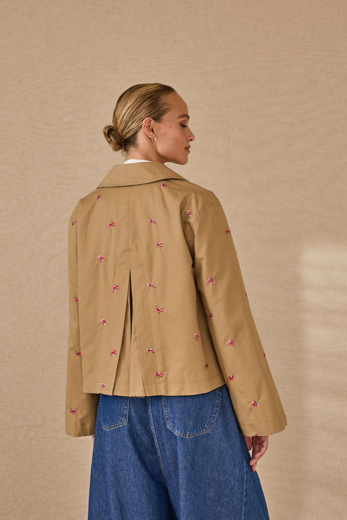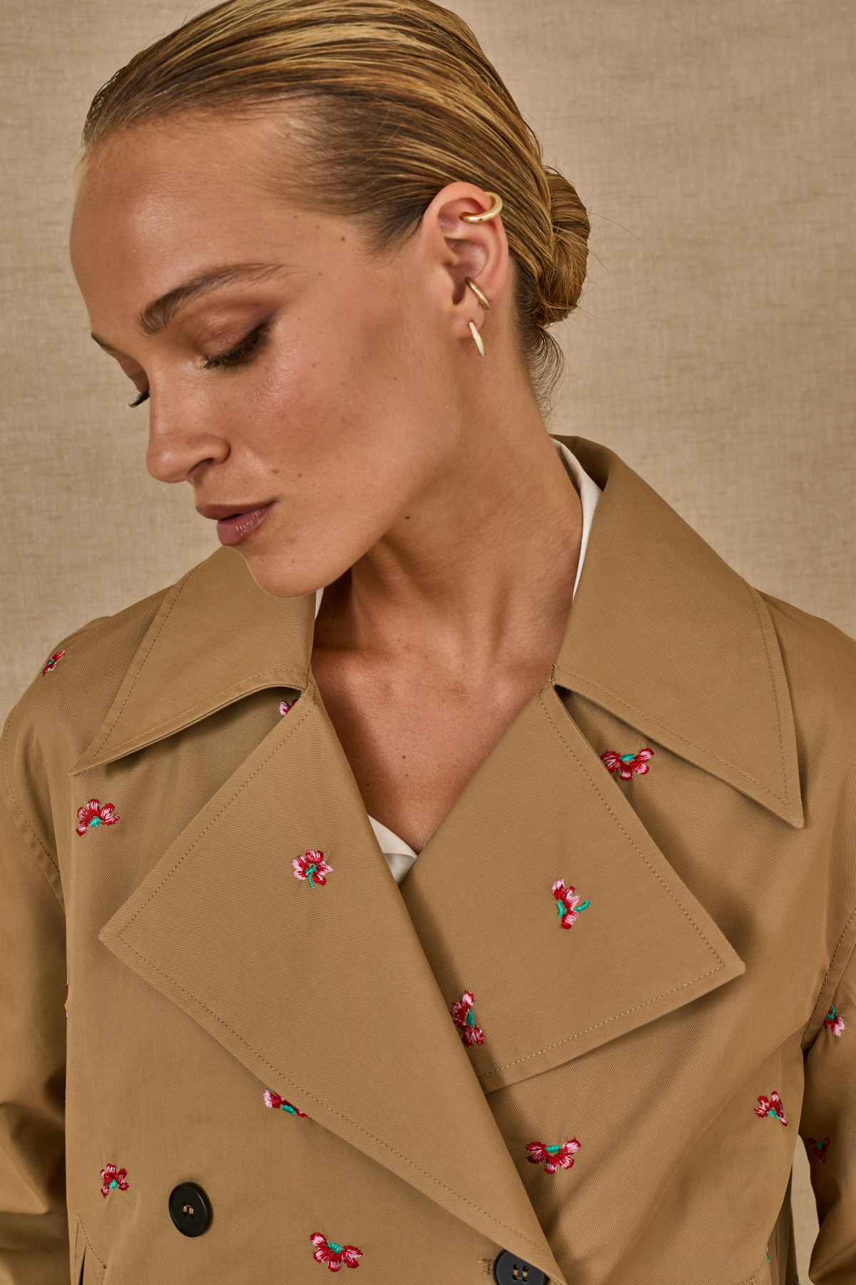 Κομψό κοντό μπουφάν με διακριτικές κεντημένες λεπτομέρειες που χαρίζουν ιδιαίτερο χαρακτήρα. Ο μοντέρνος σχεδιασμός και η άνετη γραμμή το καθιστούν ιδανικό για καθημερινές αλλά και πιο κομψές εμφανίσεις.