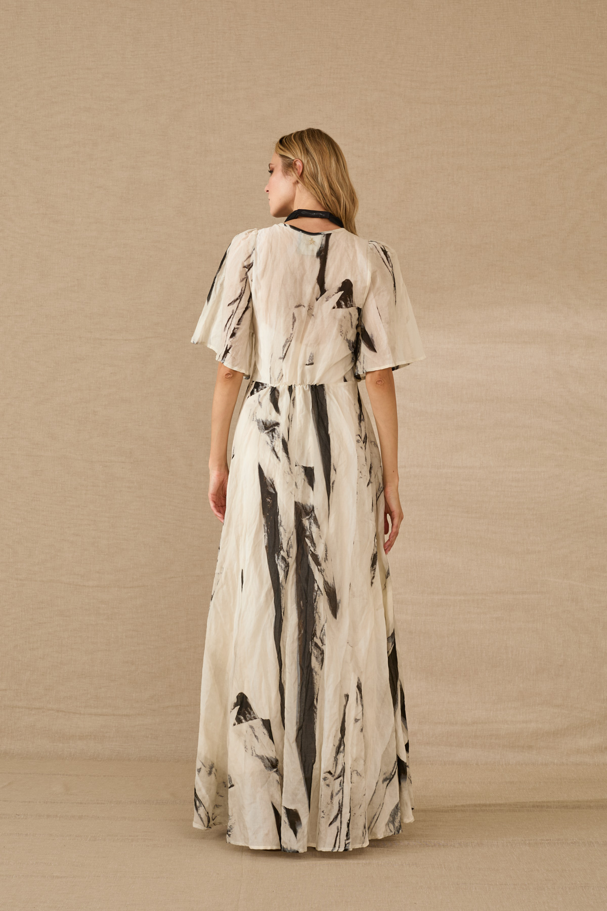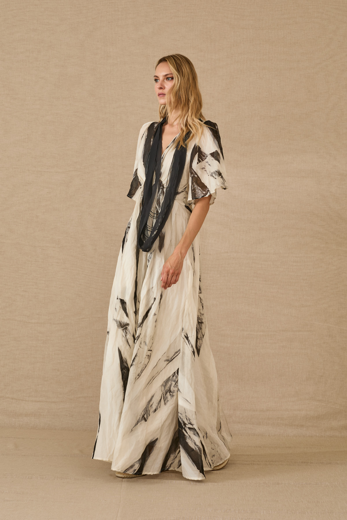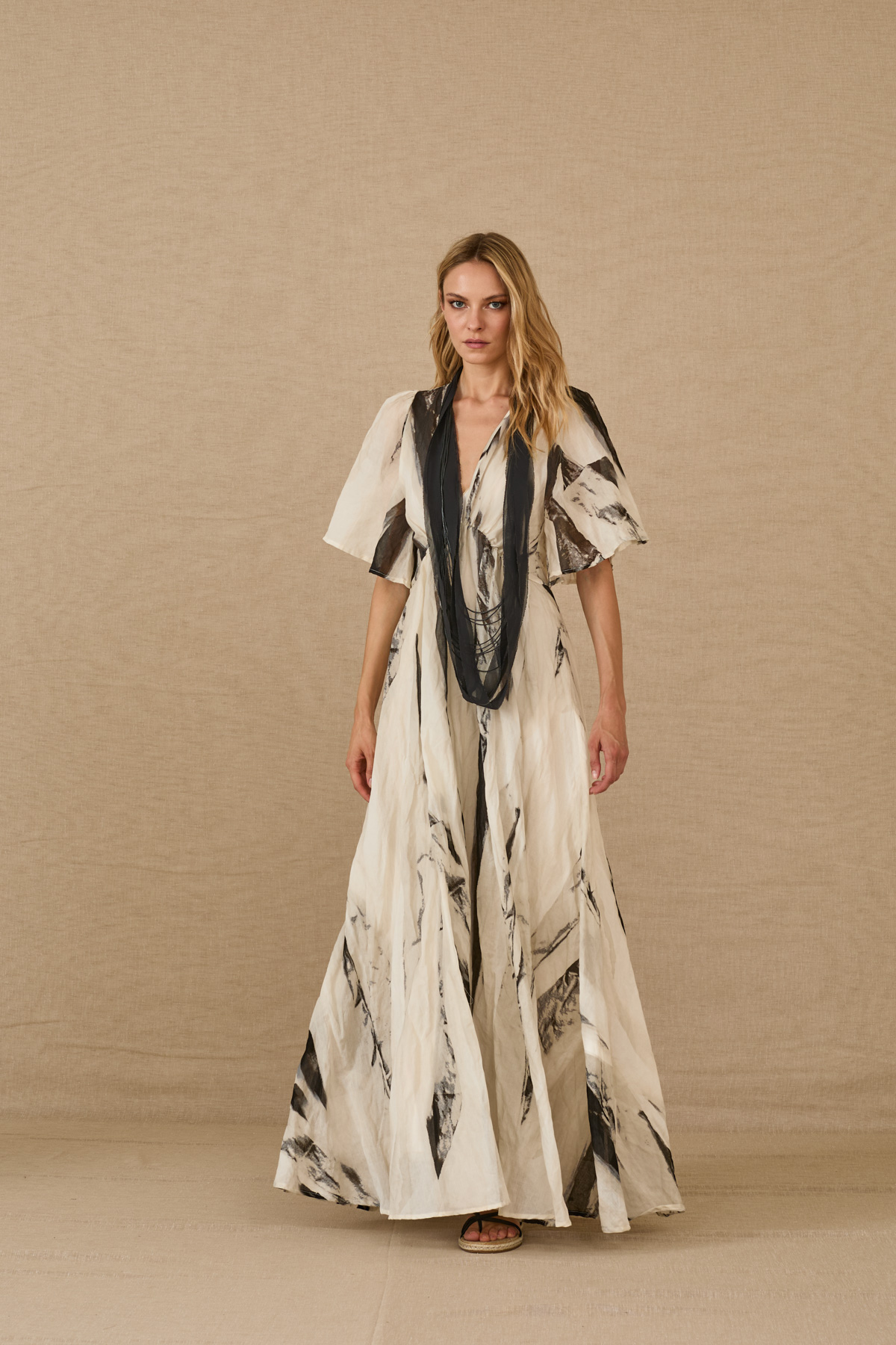 Εντυπωσιακό μακρύ φόρεμα με καλλιτεχνικό μοτίβο που χαρίζει μοναδικό και κομψό χαρακτήρα. Η αέρινη γραμμή και το ελαφρύ ύφασμα δημιουργούν μία ιδιαίτερη εμφάνιση, ιδανική για ξεχωριστές περιστάσεις και καλοκαιρινές εμφανίσεις με στυλ.