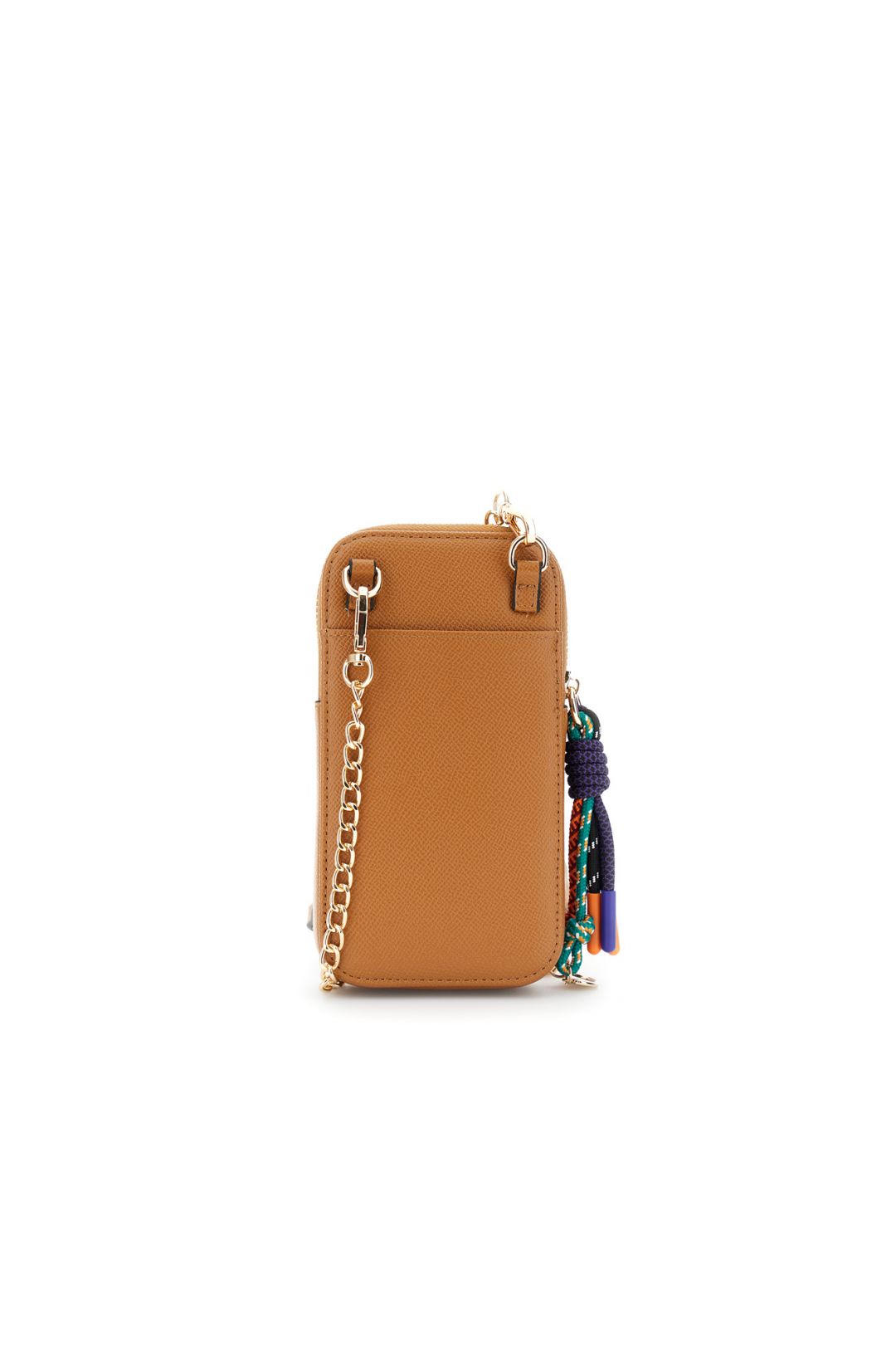 Θήκη τηλεφώνου με φερμουάρ σε εφέ Saffiano, ασορτί λογότυπο και πολύχρωμα διακοσμητικά. Αποσπώμενο λουράκι αλυσίδας με μαξιλαράκι ώμου. Κλείσιμο: Φερμουάρ